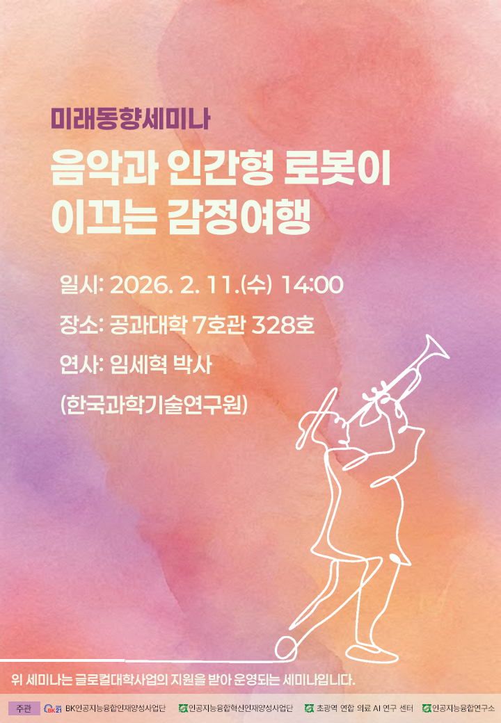 AI 미래동향(기술)세미나_음악과 인간형 로봇이 이끄는 감정여행 2026.2.11.(수) 2:00PM ~ 4:00PM 공과대학 7호관 328호 참여대상: 전체(모든사람) 행사방식 : 오프라인(대면) 공유하기