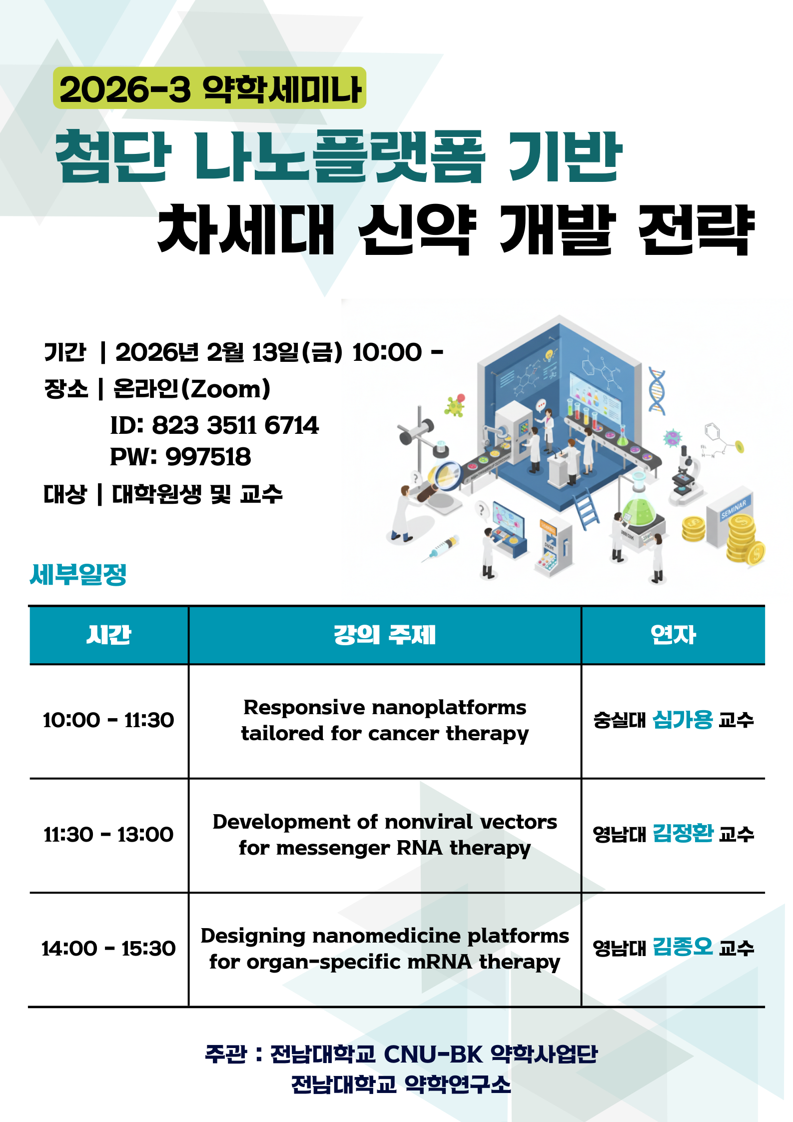 CNU-BK 약학사업단 제3회 세미나를 아래와 같이 개최합니다