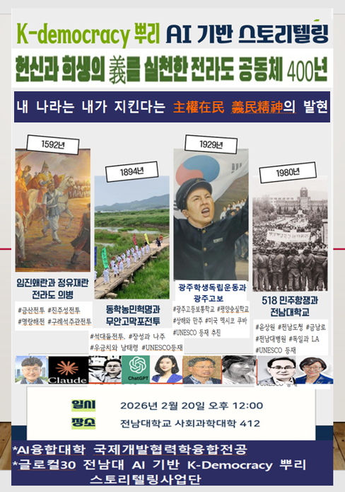 K-Democracy 뿌리, 항거와 헌신의 전라도 공동체 400년 의민정신 스토리텔링 2026.2.19.(목) ~ 2026.2.22.(일)(4일간) 사회423 참여대상: 전체(모든사람) 행사방식 : 오프라인(대면) 공유하기