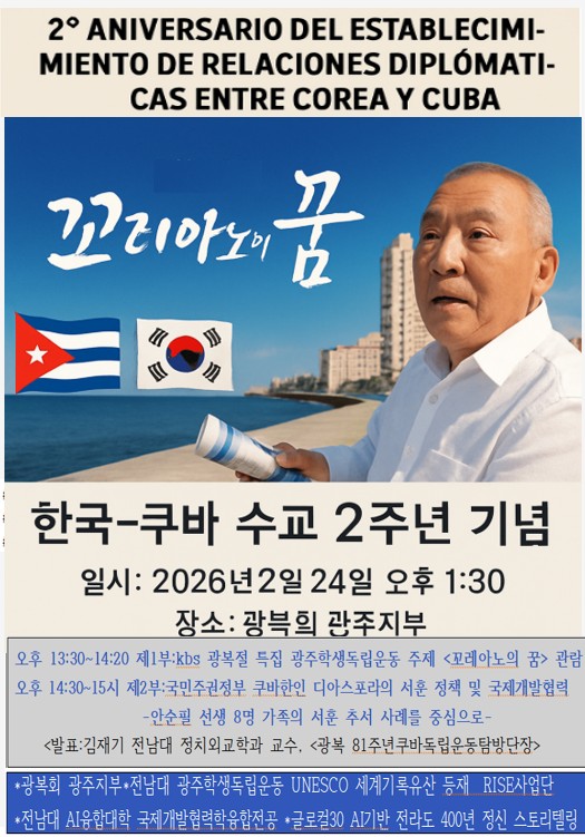 한국-쿠바수교 2주년 국민주권정부 서훈 보훈정책과 국제개발협력(ODA) 2026.2.21.(토) ~ 2026.2.25.(수)(5일간) 광복회광주지부 참여대상: 전체(모든사람) 행사방식 : 오프라인(대면) 공유하기