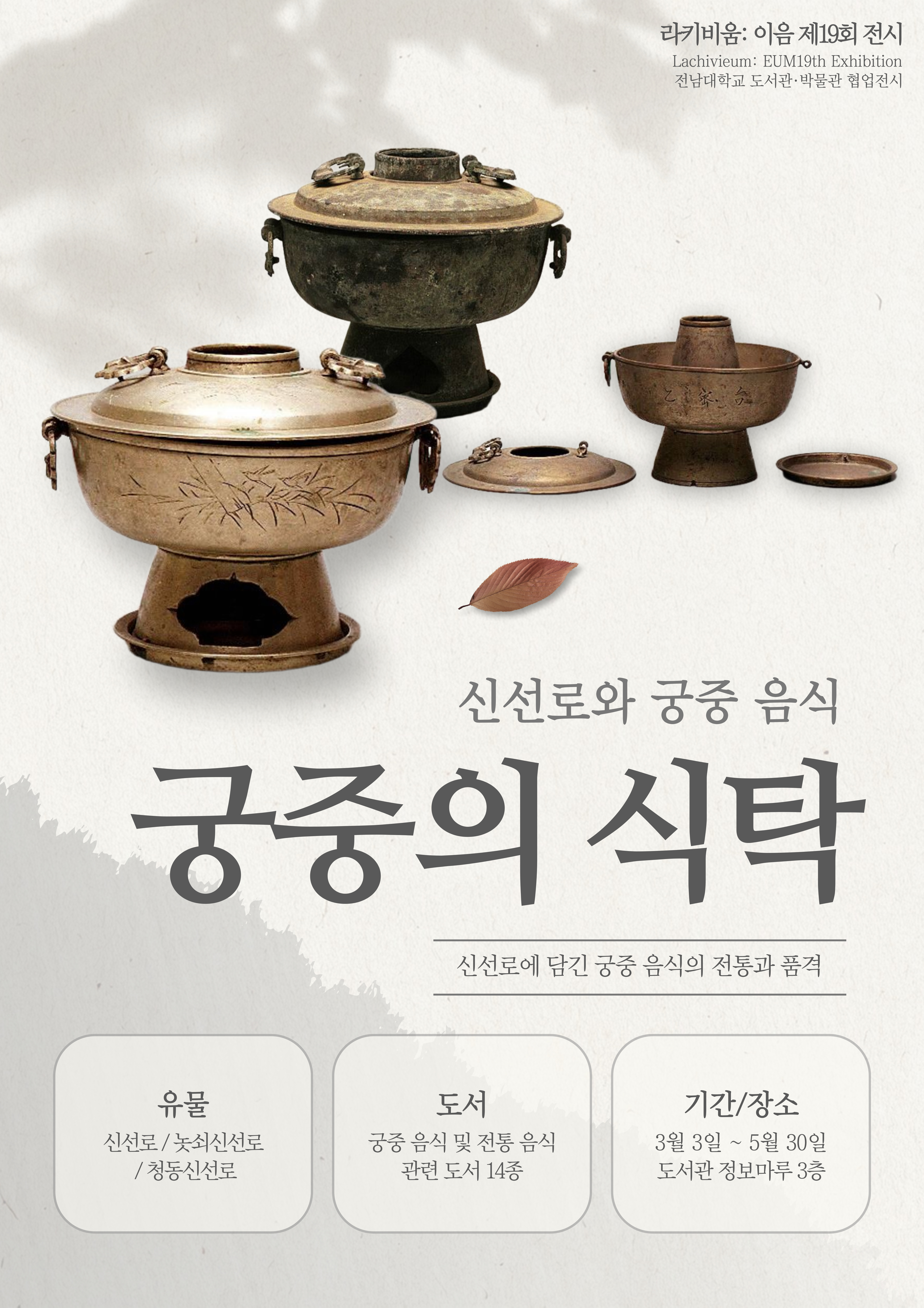 [라키비움: 이음] 제19회 전시 '궁중의 식탁' 2026.3.3.(화) ~ 2026.5.30.(토)(89일간) 도서관 정보마루 3층 라키비움 전시공간 참여대상: 전체(모든사람) 행사방식 : 오프라인(대면) 행사 웹사이트 방문 062-530-3551 / 정보마루 3층 인포데스크 문의 공유하기