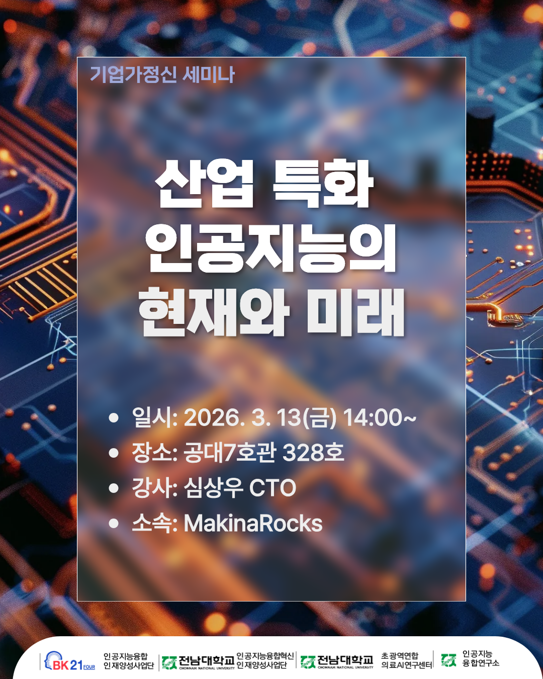 기업가정신 세미나_산업 특화 인공지능의 현재와 미래 2026.3.13.(금) 2:00PM ~ 4:00PM 공과대학 7호관 328호 참여대상: 전체(모든사람) 행사방식 : 오프라인(대면) 공유하기