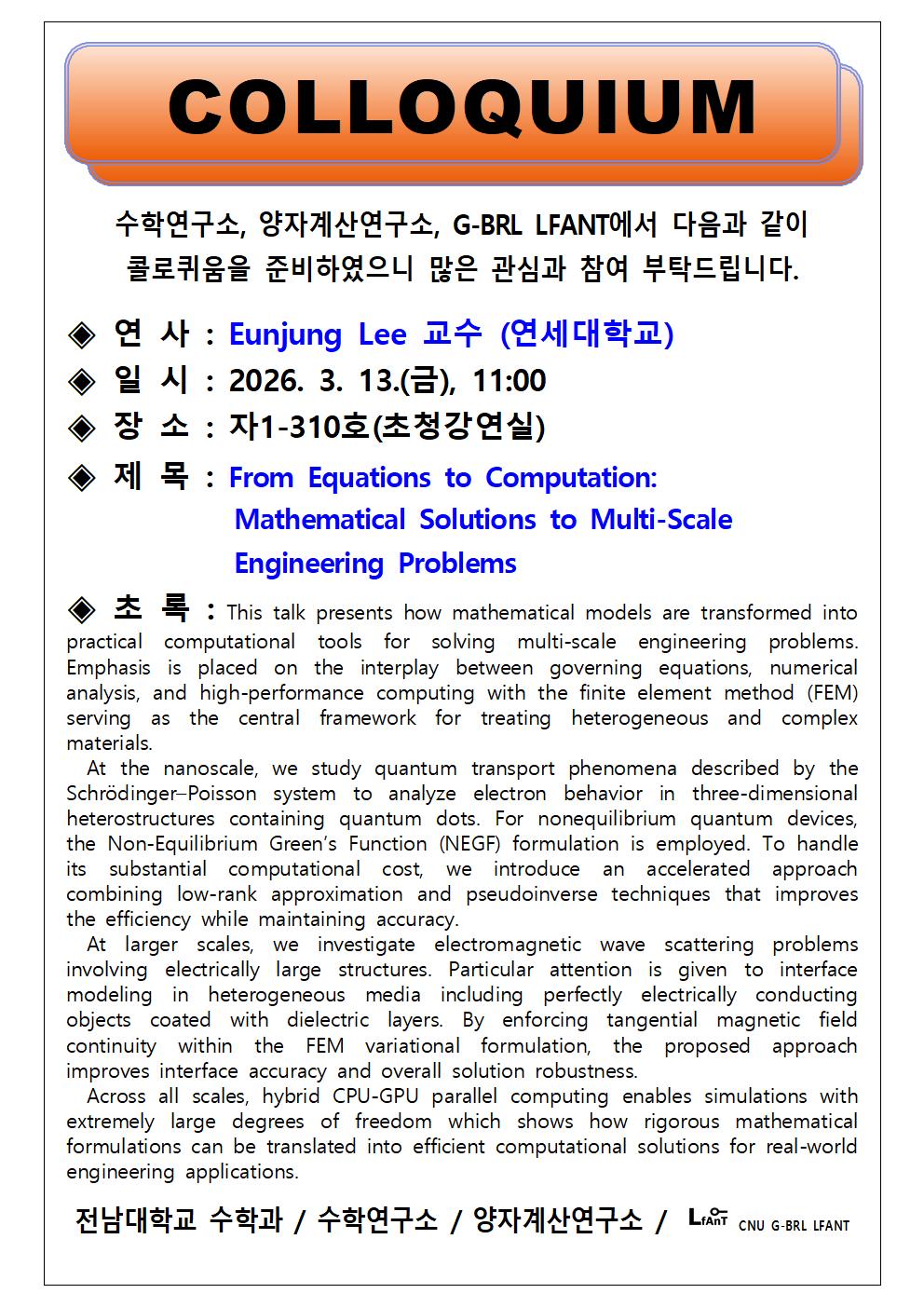 수학연구소, 양자계산연구소, G-BRL LFANT에서 다음과 같이 콜로퀴움을 준비하였습니다.