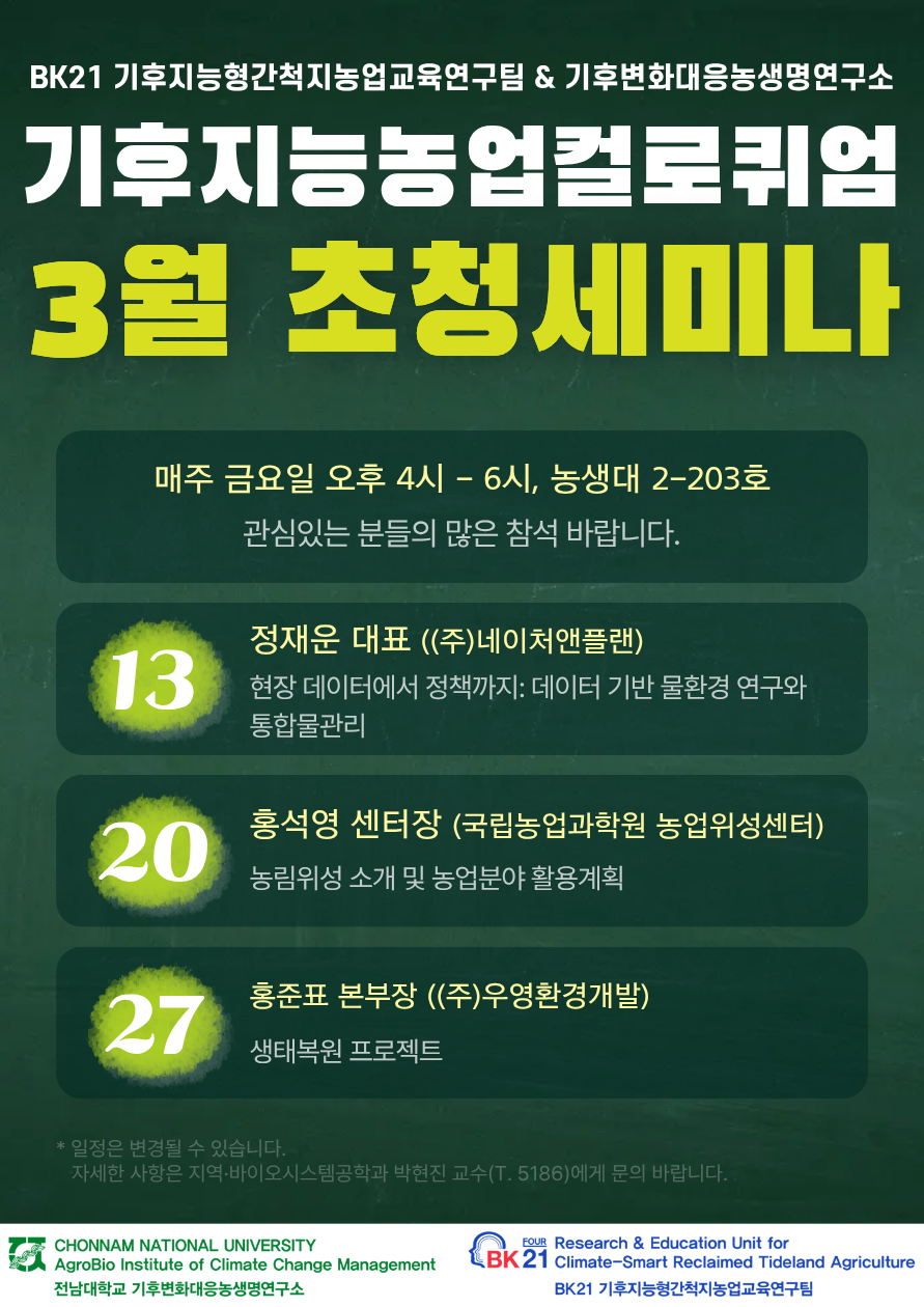 BK21 기후지능형간척지농업교육연구팀과 기후변화대응농생명연구소에 공동 주관하는 2026년 3월 국내 전문가 초빙 세미나가 아래와 같이 개최됩니다.