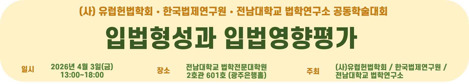 유럽헌법학회 한국법제연구원 전남대학교법학연구소 공동학술대회 2026.4.3.(금) 1:00PM ~ 6:00PM 법학전문대학원 2호관 601호(광주은행 홀) 참여대상: 전체(모든사람) 행사방식 : 오프라인(대면) 공유하기