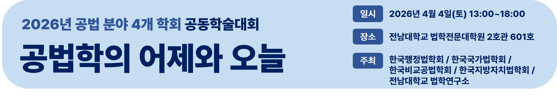 공법 분야 4개 학회 공동학술대회 2026.4.4.(토) 1:00PM ~ 6:00PM 법학전문대학원 2호관 601호(광주은행 홀) 참여대상: 전체(모든사람) 행사방식 : 오프라인(대면) 공유하기