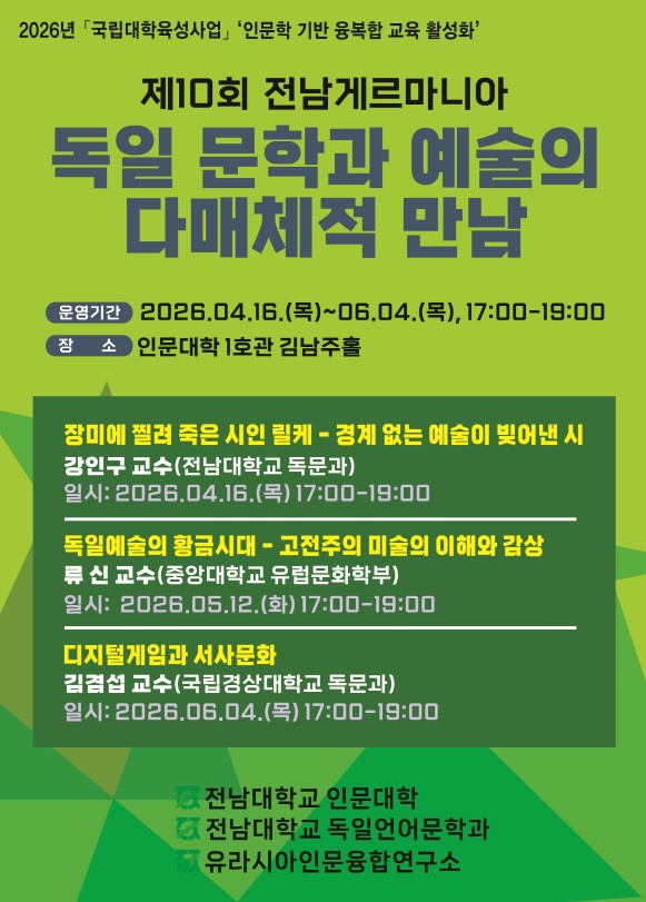 전남대학교 독일언어문학과는 독일 매니아들의 모임이라는 뜻에서 유래한 제 10회 전남게르마니아를 인문대학과 유라시아인문융합연구소와 공동으로 개최한다.
