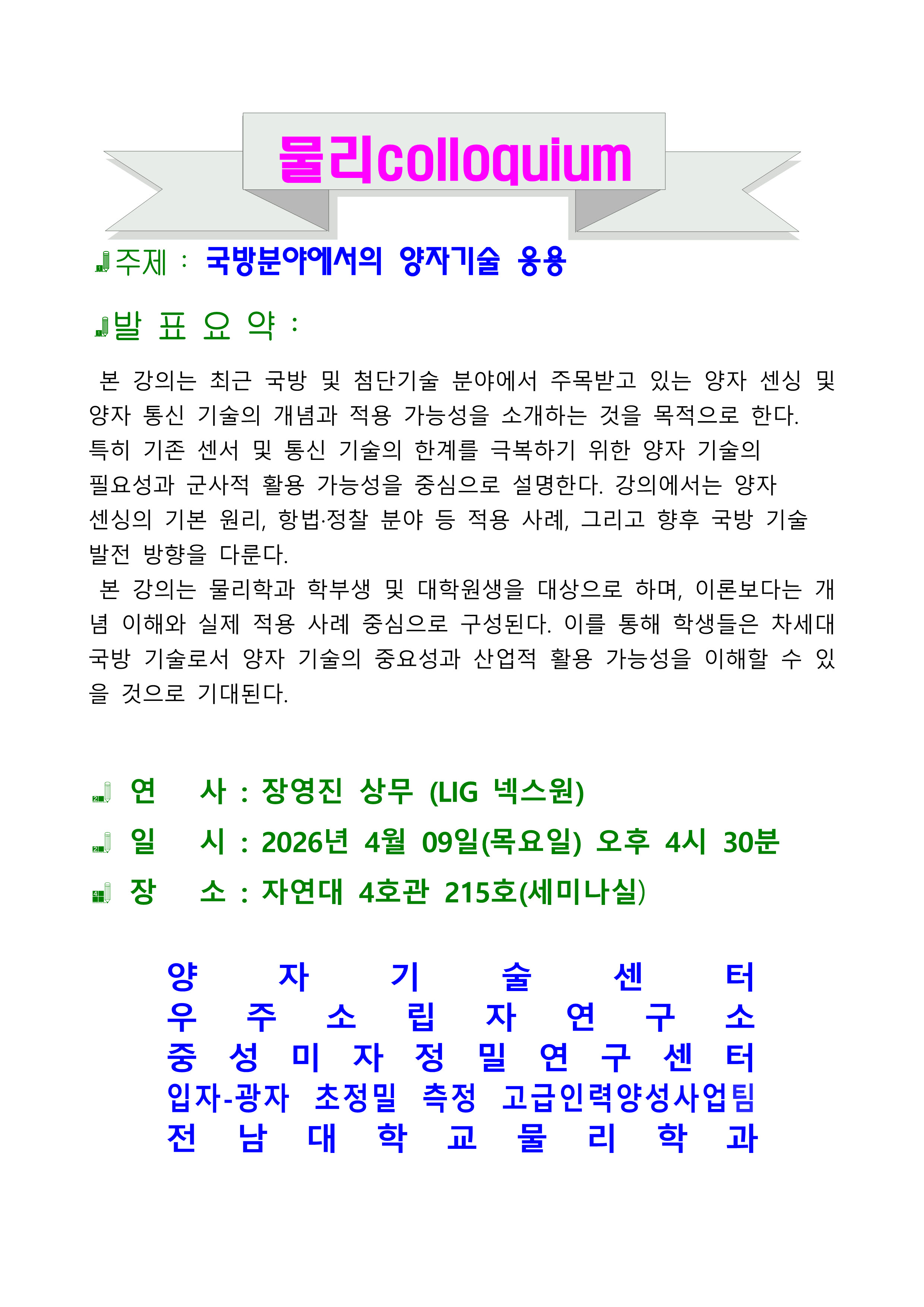 본 강의는 최근 국방 및 첨단기술 분야에서 주목받고 있는 양자 센싱 및 양자 통신 기술의 개념과 적용 가능성을 소개하는 것을 목적으로 한다.