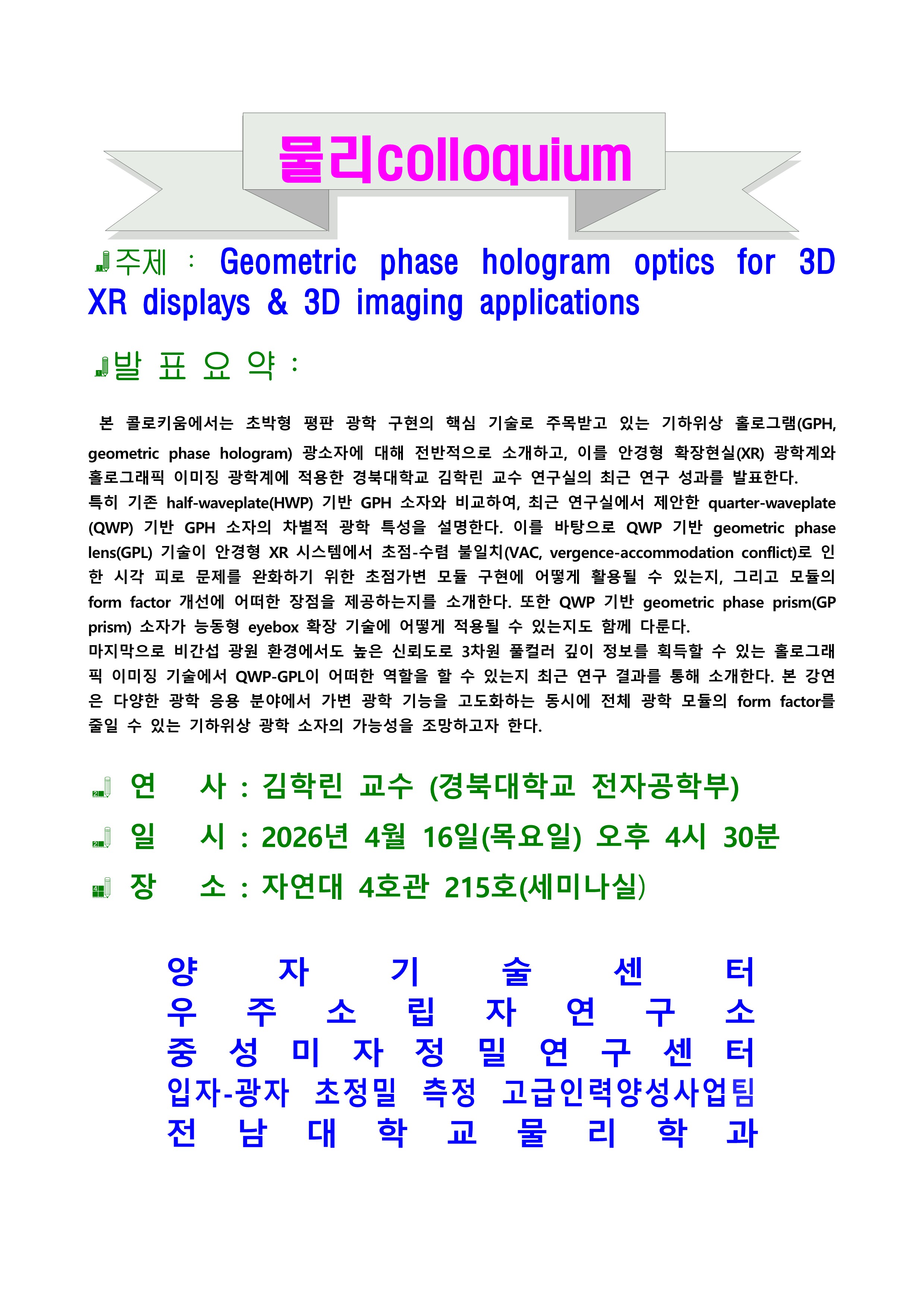 본 콜로키움에서는 초박형 평판 광학 구현의 핵심 기술로 주목받고 있는 기하위상 홀로그램(GPH, geometric phase hologram) 광소자에 대해 전반적으로 소개하고, 이를 안경형 확장현실(XR) 광학계와 홀로그래픽 이미징 광학계에 적용한 경북대학교 김학린 교수 연구실의 최근 연구 성과를 발표한다.