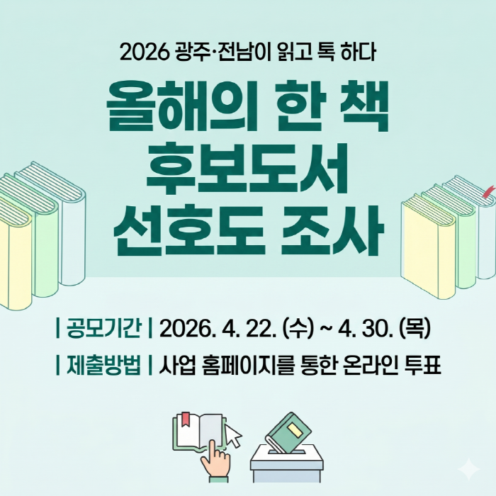 2026년 [올해의 한 책] 선정을 위한 선호도 조사 안내 (기념품 증정) 2026.4.22.(수) ~ 2026.4.30.(목)(9일간) 참여대상: 전체(모든사람) 행사방식 : 온라인(화상회의, 실시간영상 등) 온라인 참여 링크 0625303533 공유하기