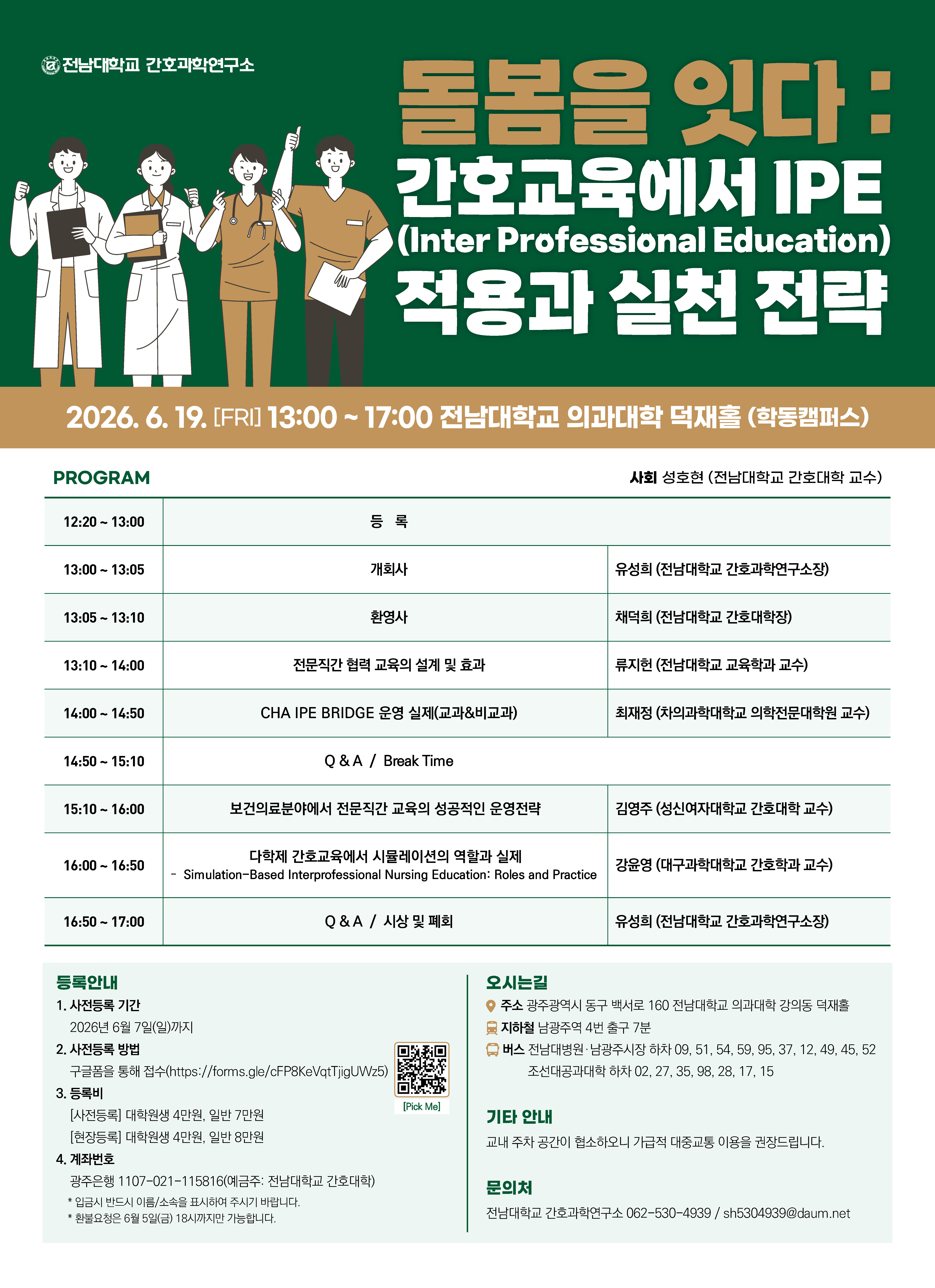 전남대학교 간호과학연구소에서는 ‘돌봄을 잇다 : 간호교육에서 IPE(InterProfessional Education) 적용과 실천 전략’을 주제로 2026년도 춘계학술대회를 아래와 같이 개최하오니 많은 관심과 참석 부탁드립니다.